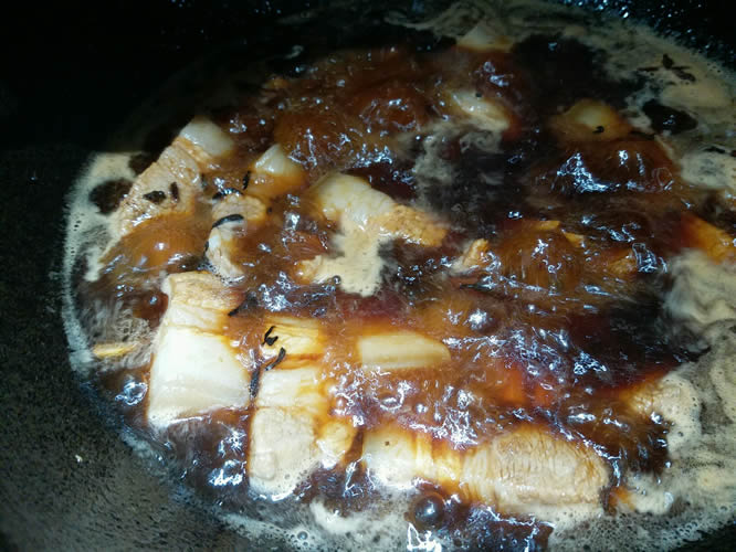7加入料酒,冰糖,盐,生抽,茶水等。水量没过肉块