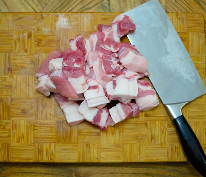 4、切五花肉前可以先将五花肉略冷冻一会,切起来更方便。