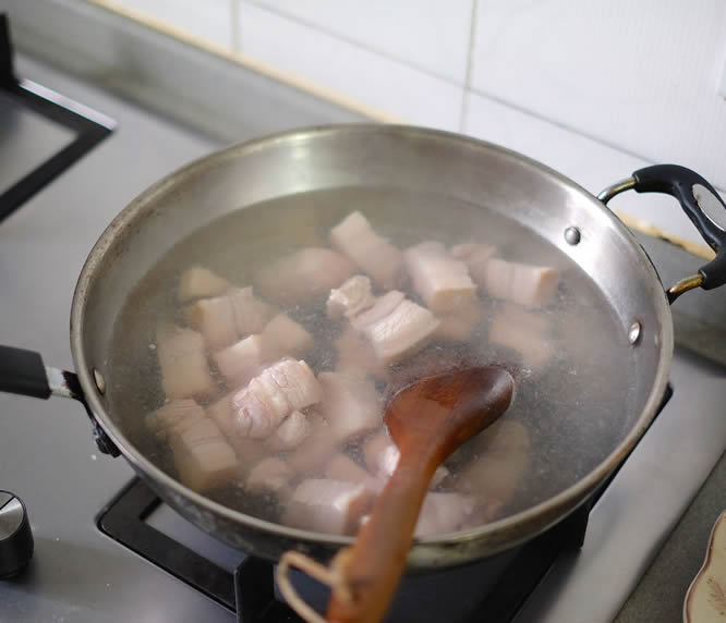 2 煮一锅冷水,然后将肉放入,水和肉一起煮开后关火,将肉捞出沥水备用。