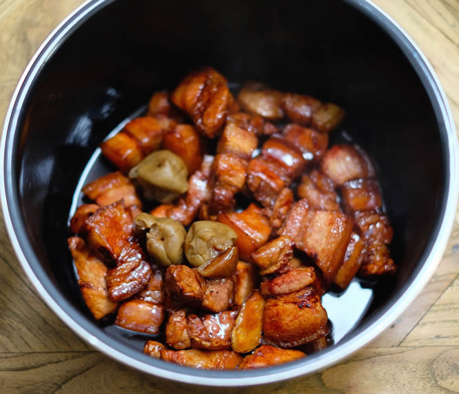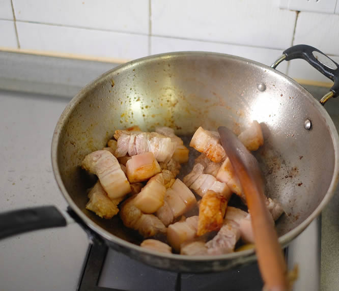 5、放入红曲粉或是红腐乳可以使红烧肉的色泽更美丽。