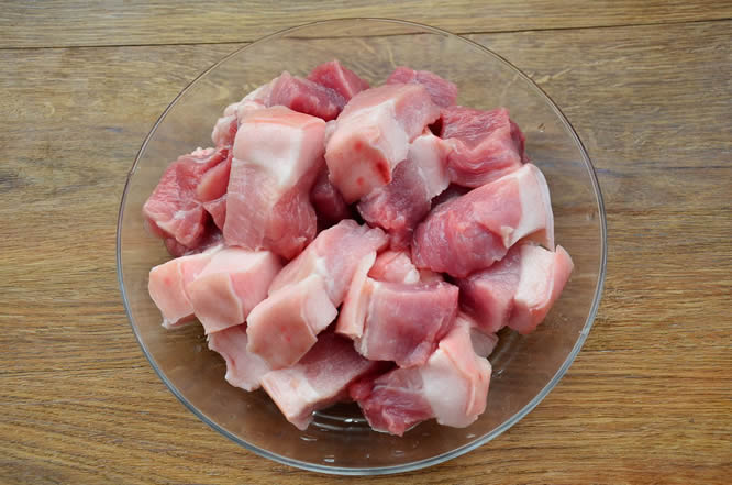 1将猪肉清洗干净,切成块状,最好切大一些,吃起来比较过瘾。(猪肉最好选用带皮五花肉,肥瘦相间,吃起来比较过瘾,我没有买到五花肉,所以用的后腿肉,味道不影响哈)