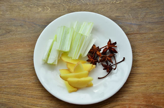 2葱切段,姜切片,八角冲洗干净备用