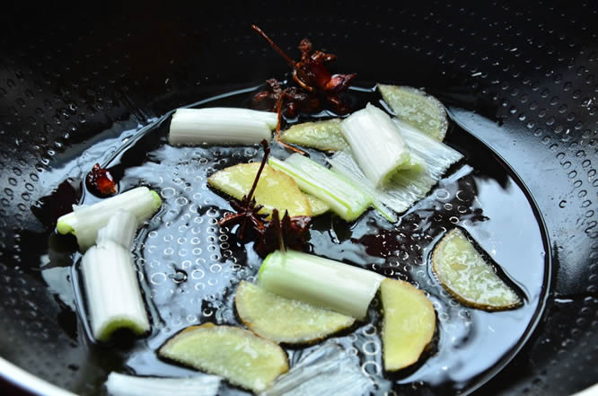 4另起油锅,将八角 葱段 姜片加入炒香