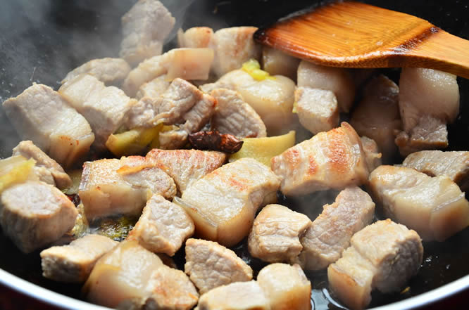 5将猪肉加入煸炒至出油,表面焦黄