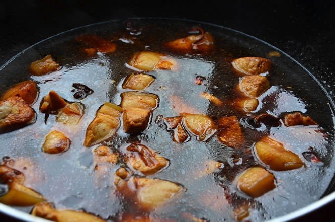 7向锅内加入开水,一定是开水,完全没过猪肉,因为炖得时间比较久,要多加一些,将冰糖加入锅中,调适量盐