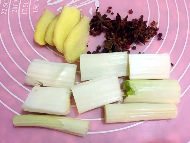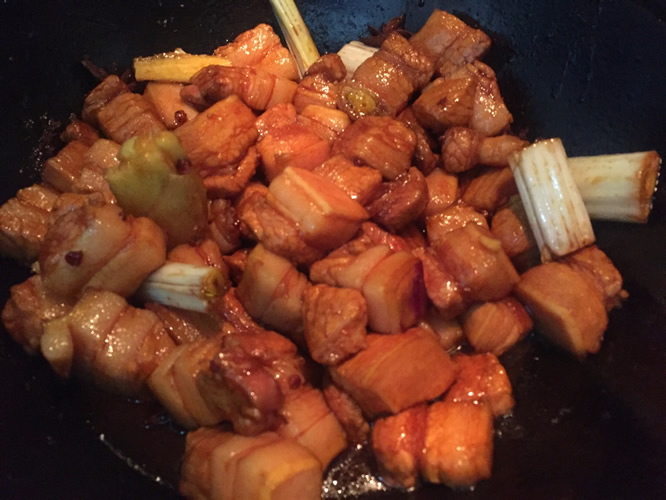 5越炒颜色越深,加入葱段,姜片,花椒,八角,生抽继续翻炒,可以看到炒出很多的油来,这样做好的肉肥而不腻