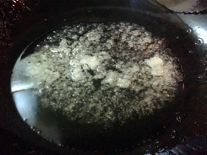 3冰糖砸碎,锅中倒入适量油,油热倒入冰糖炒糖色,炒至冰糖完全溶化呈褐色
