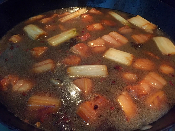 6加入没过五花肉的水大火烧开,撇去浮末,加入料酒转小火炖煮一个小时