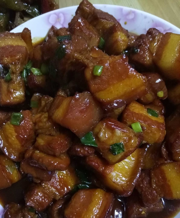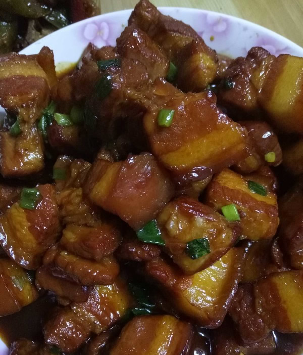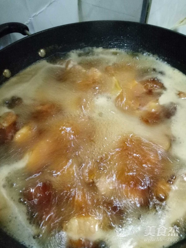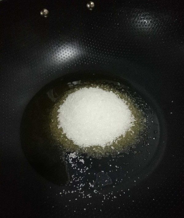 4 糖炒好后将肉下锅炒至金黄加入少量酱油继续翻炒
