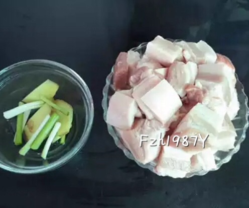 1准备所需材料,先将五花内洗净切方块,姜洗净切片,葱切段
