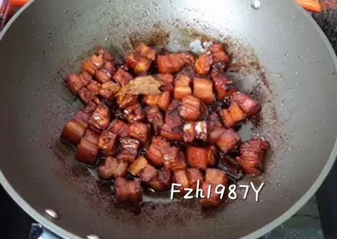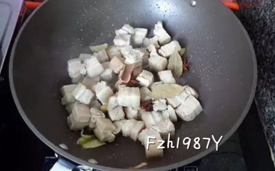 4加入焯烫好的五花肉,再加入八角、香叶、桂皮炒至五花肉出油,然后把多余的油倒出来;