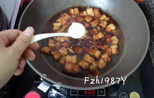 6 然后加入适量的清水、冰糖、盐,清水抹过五花肉即可;