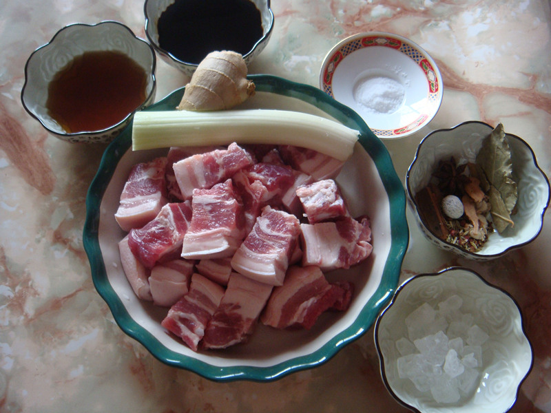 1准备食材: 主料:五花猪肉600克(切成小方块); 配料:大葱:1根,姜:1块,八角:1颗,香叶:3片,桂皮:1块,小茴香:1小把,花椒:1小把,白芷:2块,良姜:1块,肉寇:1个(如果您家中没有这么多香料,可缩减成葱、姜、八角、香叶、桂皮、花椒),料酒:60ML, 生抽和老抽:共80ML(生抽和老抽的比例为2:1),盐:7克,冰糖:1把,清水适量。