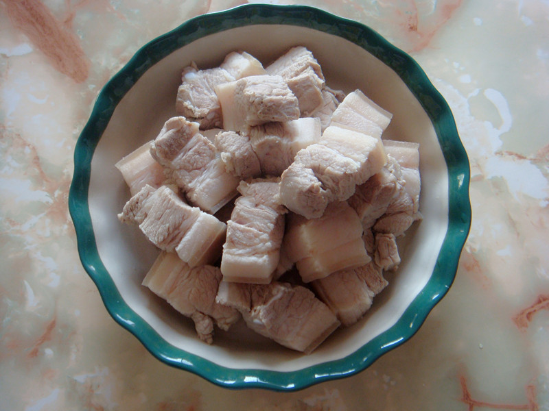 2五花肉焯烫后,捞起洗净控干水份备用。