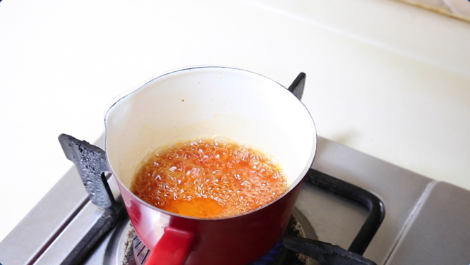 3加热水的颜色变成琥珀色,然后倒入200ml清水继续煮至冰糖溶化即可关火。煮好的焦糖水放在一旁备用。