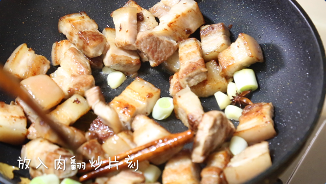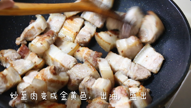 7炒锅里不放油,放入肉中小火煸炒至肉变成金黄色,将肉中的油炒出一些。然后盛出肉。