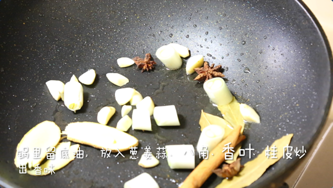 8炒出的油入锅多多话可以倒掉一些,留些底油,放入葱姜蒜、大料、香叶、桂皮炒出香味。
