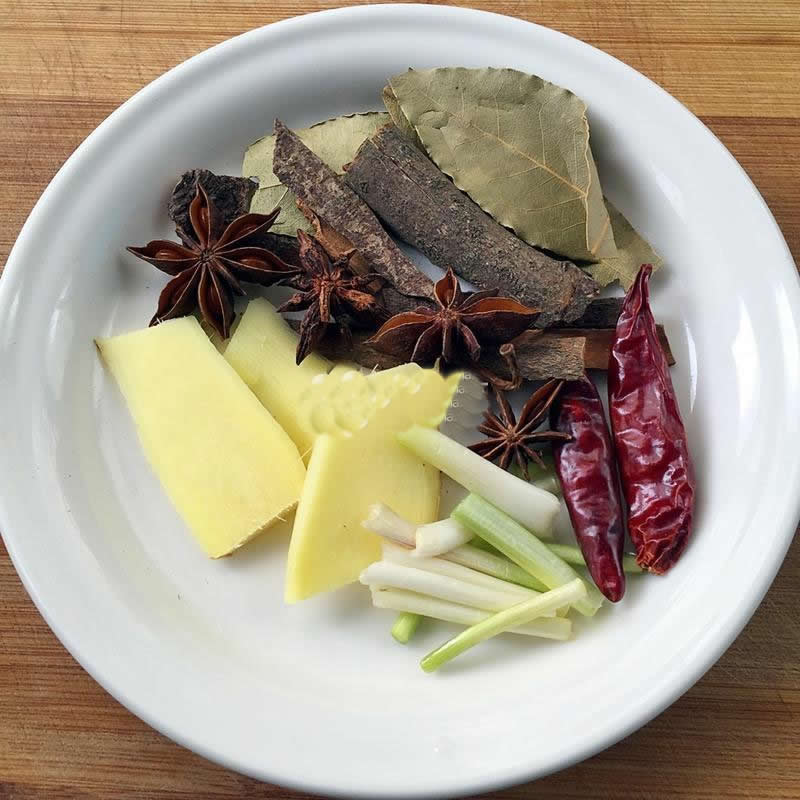 2准备好大料(八角、桂皮、香叶、干辣椒、生姜、葱段)