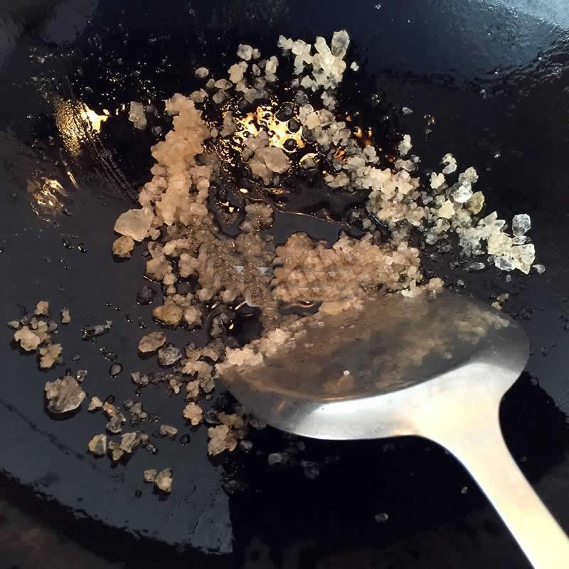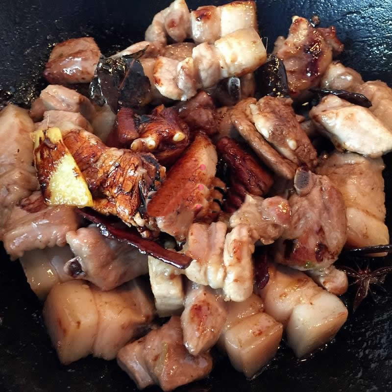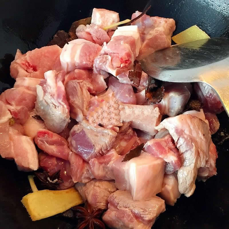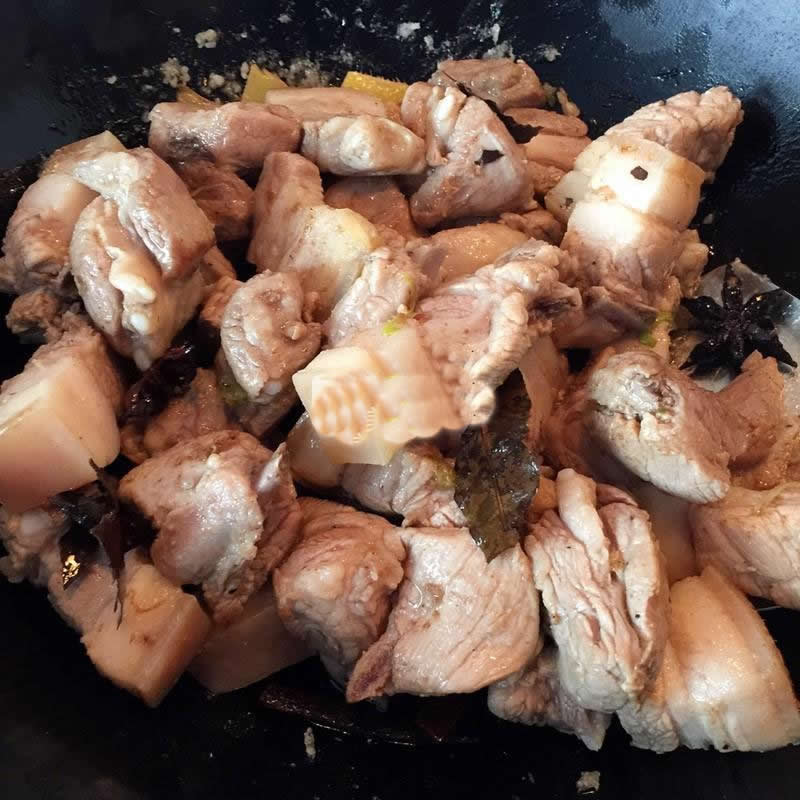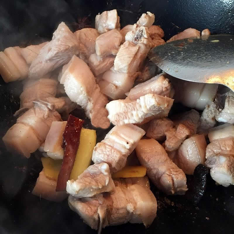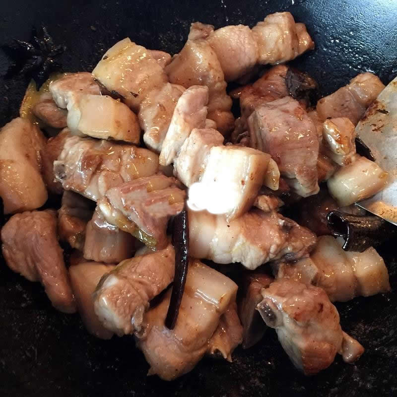 6将锅洗净后倒入少量的油放入冰糖,小火慢慢炒至冰糖融化并开始冒小泡,这个时候可以倒入炒好的肉块,这也就是所谓炒糖色