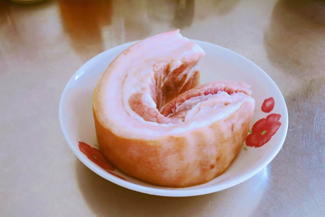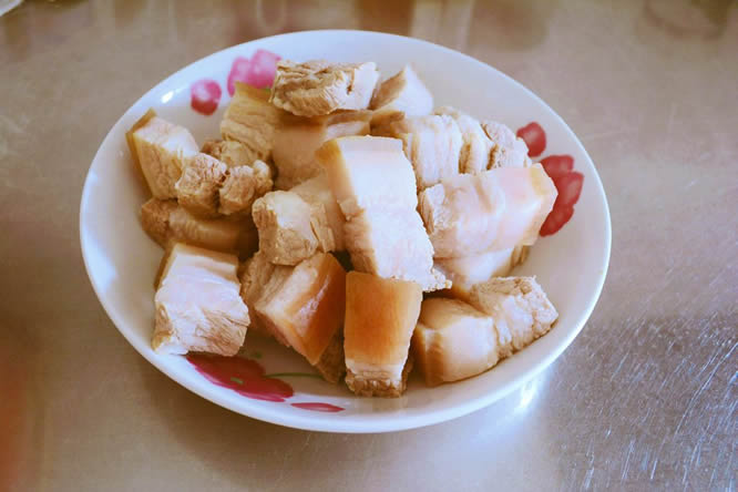 5然后切成麻将大小的块。 可能还有人问:为什么不先切好在过水? 我觉得先切好的在过水,肉皮受热回缩,肉不见方,影响美观! 当然自己家吃不需要那么多形式,完全看你喜好而决定次序~