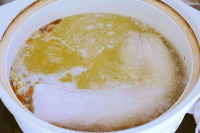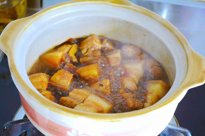 8在放入五花肉,填上适量的水(适量就是刚好和肉平齐,如果不是砂锅这个水量可能就不合适了,在结合实际情况来调整!)放入生抽和老抽(生抽调味,老抽上色。不需要放盐,全平这两种来控制咸淡),在放入半勺转换糖浆。(对,就是做月饼的转化糖浆。没有就放点冰糖,倒入两滴醋,醋不可以多放)。