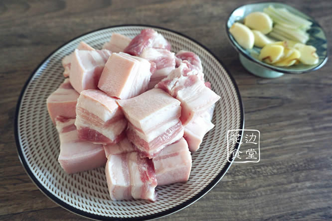 1五花肉洗净,切成3cm左右的正方形肉块。葱切段、姜切片