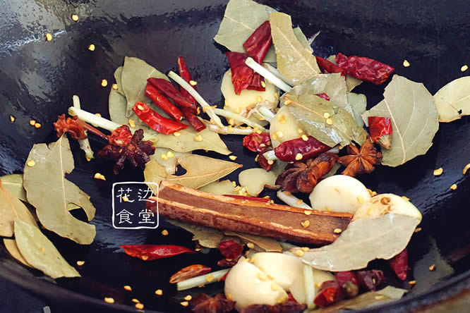 4热锅下少许油,倒入葱姜蒜、干辣椒、香叶、桂皮、大蒜、八角、葱段炒香