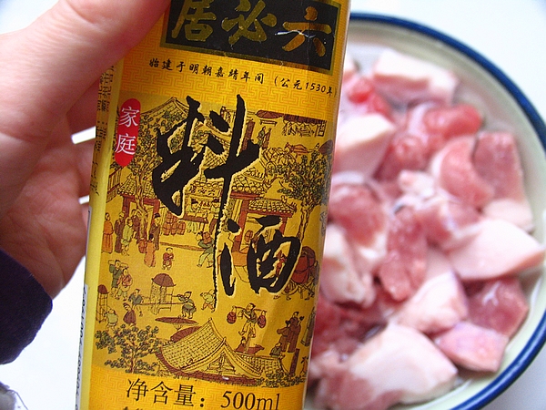 1五花肉切自己喜欢大小的块,大碗中,加水,倒入适量料酒腌十五分钟