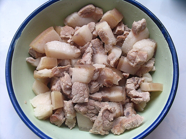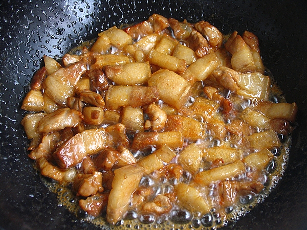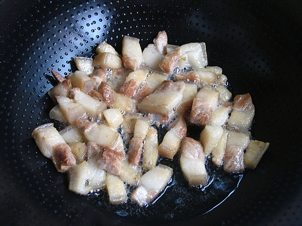 3干锅,不放油,放入软肥的肉块煸炒至微微变色。