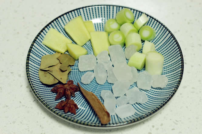 3准备葱段,姜片,八角,桂皮,香叶 冰糖15颗左右
