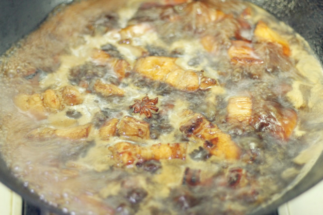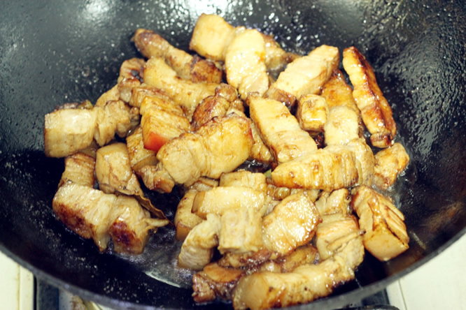 8冰糖溶化后 倒入提前炒好的五花肉 酱油两勺 老抽一勺
