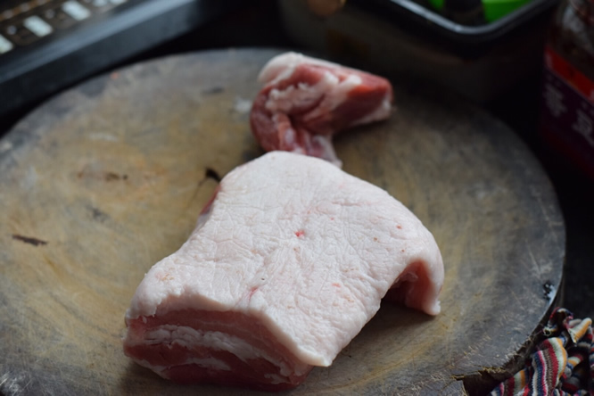 1五花肉解冻,这块一斤半多,看起来挺大,但是烧的过程会缩小。一般一家三口吃两餐,如果人数有多,需要相应增加分量(四个人一斤八两,五六人两斤,以此类推)。我每次买的都是金锣门店的排酸肉,具体原理不懂,但是的确比一般五花肉容易烧烂,而且浮末不多,没有骚味,买不到的挑选肥瘦相间(最好能有三层以上肥瘦间隔)的五花肉即可。