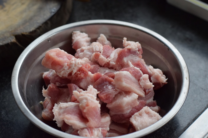 2肉切块,因为红烧过程中肉体积会缩小,所以略微比预想大小切得大一些,留出缩水空间。不要切得过大,这样红烧时间会变长。