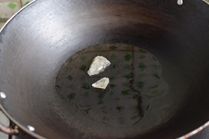 4锅中放少许油,铺满锅底即可,放冰糖。中火。