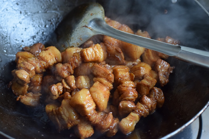 6多翻炒一下,让肉均匀裹上糖色。这一步时间略久是为了让肥肉中的油走出一些,这样成品不会一咬一嘴油,使肉肥而不腻。等锅内温度再次升高(翻炒时听到滋滋声),从锅边淋入两锅铲料酒,并倒入香料,继续翻炒。(这一步保持中到大火是为了让料酒快速蒸发,只留下香味,如果火太小,料酒下锅后锅内温度太低,酒味就容易留在肉上)。