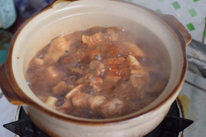 8将肉和汤汁转入砂锅(那种铸铁的煲也可以),砂锅保温性好,导热慢,可以让肉加热均匀,炒菜用的铁锅底薄,导热快,水分蒸发快,肉口感容易柴和干。先大火烧开,后转中小火炖煮,盖上盖子。