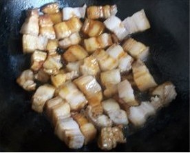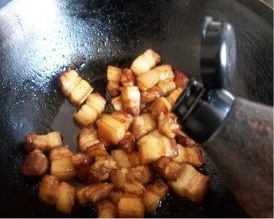 7倒入氽烫好的五花肉块快速翻炒