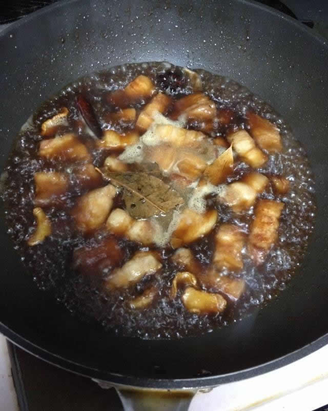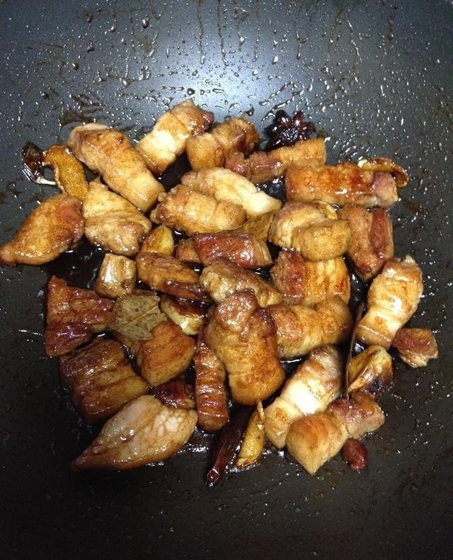 5调小火加入适量生抽.老抽.冰糖.料酒继续翻炒至肉全部上色
