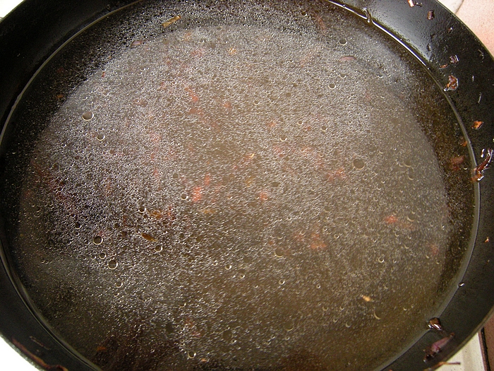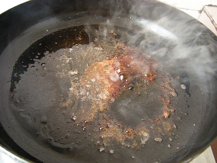 6平底锅中油倒出大部分,留一点放入冰糖,小火熬至冰糖变红棕色。