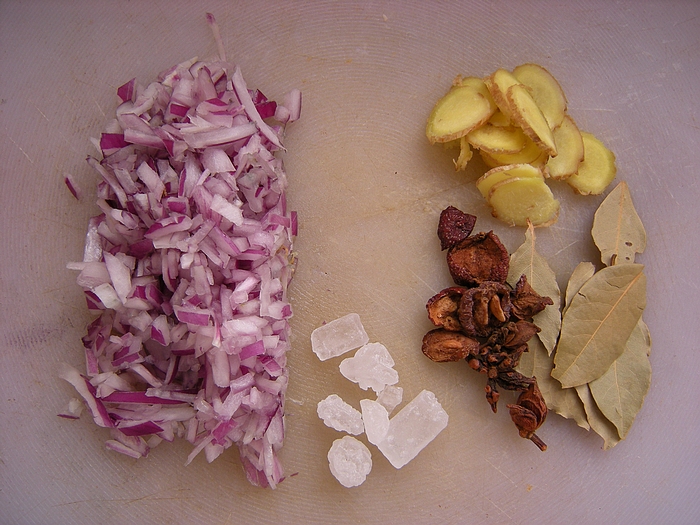 7加入姜、洋葱末、八角、香叶、山楂干炒香
