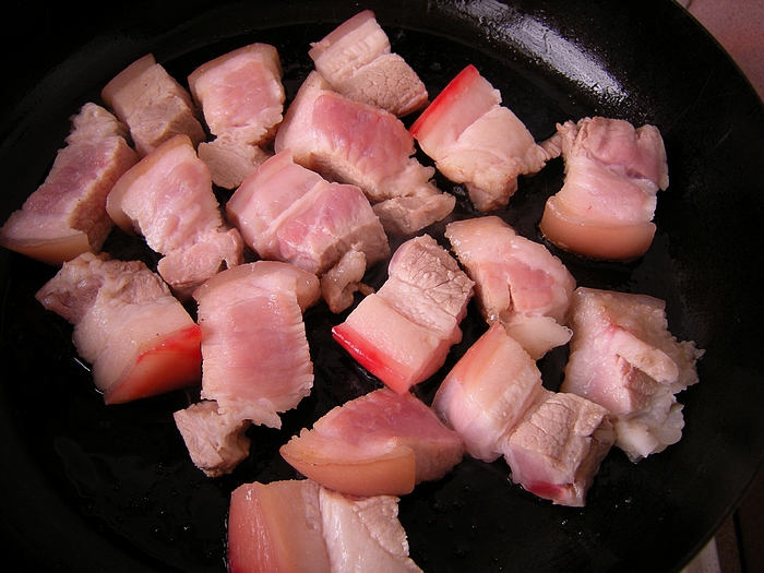 3平底锅加一点有,放肉块小火煎。