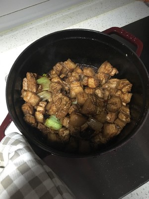 5沿锅边加入热水 没过肉即可 再加入料酒和酱油适量 一两勺盐 然后小火炖五十分钟