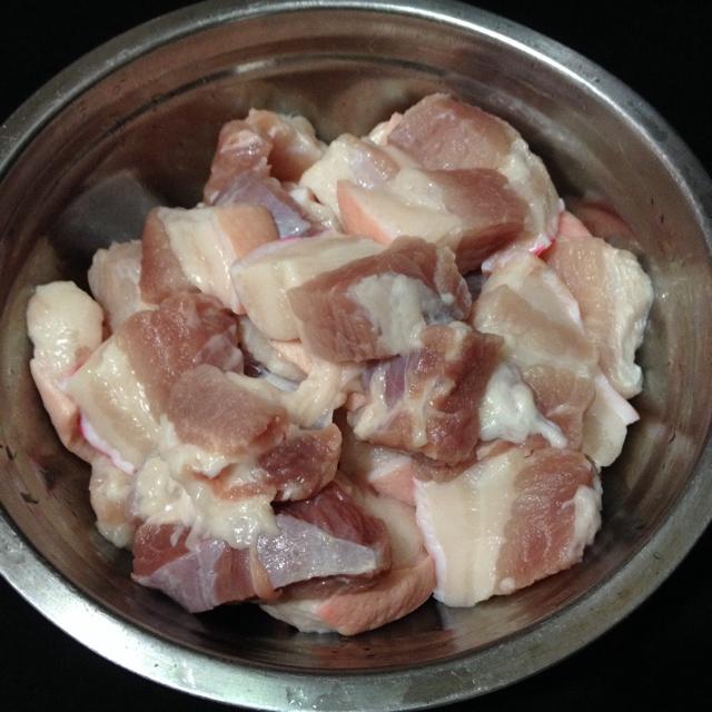 1肉甪清水浸泡一小时去血水,中途换水,洗净,用吸油纸巾吸干水份,切块备用。