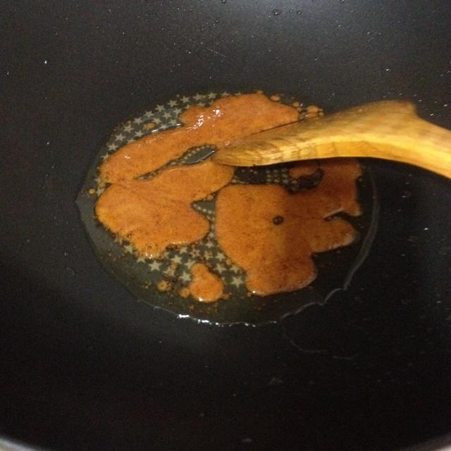 4锅置火上,倒入15ml植物油, 15克白糖,开小火熬糖色。