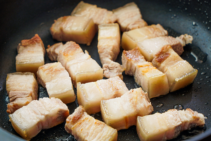 3五花肉入油锅,煎至肉皮微焦,出油。