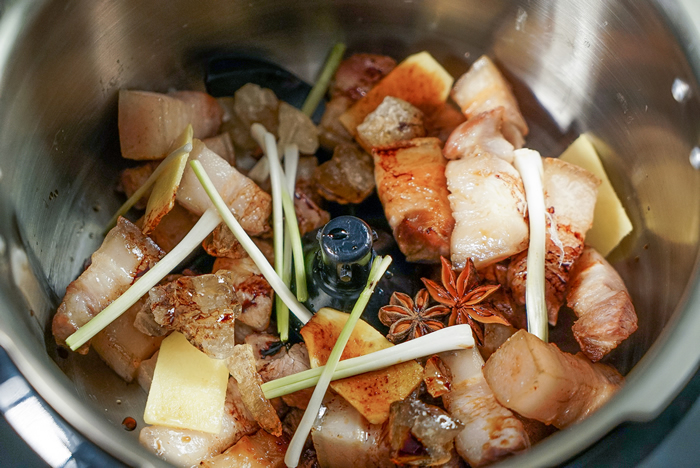 4用锅内的油爆香姜片和葱段,放黄冰糖炒出糖色。倒入煎过的肉翻炒上色,加花雕酒、八角、少许生抽和盐。无需加水,加盖小火炖煮30分钟左右(糖色不够可酌情加老抽)。 注:上面是普通做法,我是用的原汁煲,把煎好的五花肉放入煲中,铺上姜葱、黄冰糖、八角2颗,倒入少许花雕酒、1勺生抽、2勺老抽和适量盐,用"无水料理-肉类"模式烹制20分钟。
