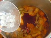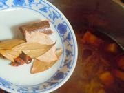 12将炒锅里的肉块连同汤料一起倒进高压锅里,加入香叶和桂皮大料。