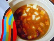14用高压锅炖三十分钟后,将顿好的肉块和料汤倒进砂锅里,把土豆块倒进去,再加两勺盐大火煮20分钟,收一下汁,土豆块也会炖的很软了。