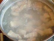 5锅里倒入足量清水,放入五花肉块焯一下水,锅开后焯两分钟就可以了。