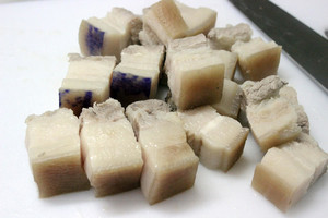 1猪五花肉【整条】放进开水里煮至熟透,捞出之后切成大块滤干水备用。